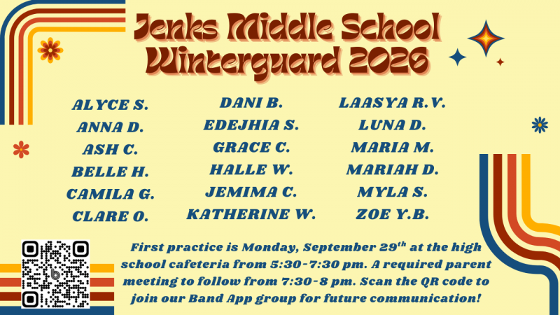 Congratulations to the following students who have made the 2025-2026 Jenks Middle School Winterguard! Our first practice is Monday, September 29th from 5:30-7:30 at the high school cafeteria with a required parent meeting to follow from 7:30-8 pm! Please scan the QR code to join our Winterguard Band App page for further communications throughout the season!